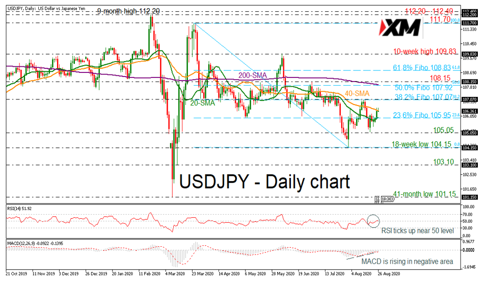USDJPY在近几日一直在小幅走高,但仍在五个月周期图内维持下行走势。目前价格正在试探40日移动平均线(SMA),而相对强弱指标(RSI)正在50水平附近徘徊。同时,异同移动平均线(MACD)正在看跌区域内走高,意味着短期内可能会有上行回撤。