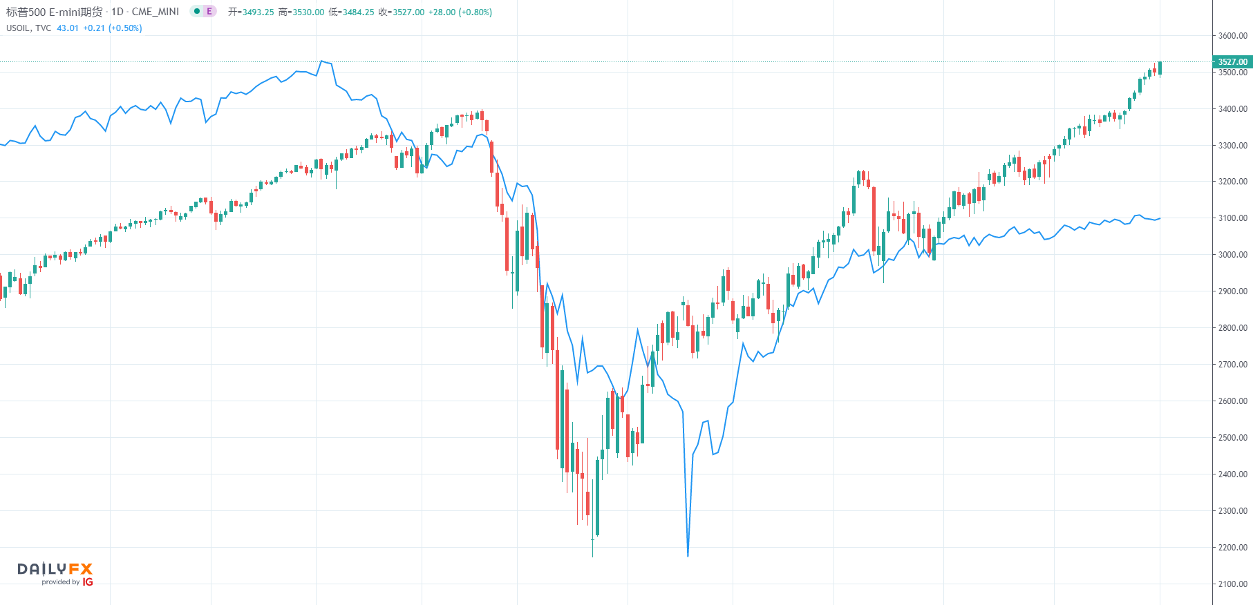 美国三大股指隔夜受益于此进一步刷新历史高位,其中标普500指数更自3月23低位2309大幅上涨逾60%。不过,同样作为反映经济的代表原油并未如股市般持续上涨,这或因疫情主要对实体经济构成冲击而非此前历史上金融危机般直接对金融系统构成伤害。