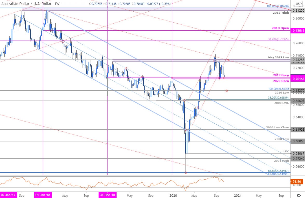 澳元本周兑美元下跌超0.3%,目前来到关键支撑位0.70附近,为年内第五次。笔者在之前的周线技术分析文章里指出,“澳元/美元虽然自支撑位反弹,但短期上行动能可能不是十分强劲,汇价无力突破0.7295则风险仍然倾向下行,若跌破0.7016则将迎来更大程度的回落”。自那以来,澳元/美元最高触及0.7243后便调头下行,昨日加速下行测试关键支撑位0.7016/42(2020/19年开盘水平)。