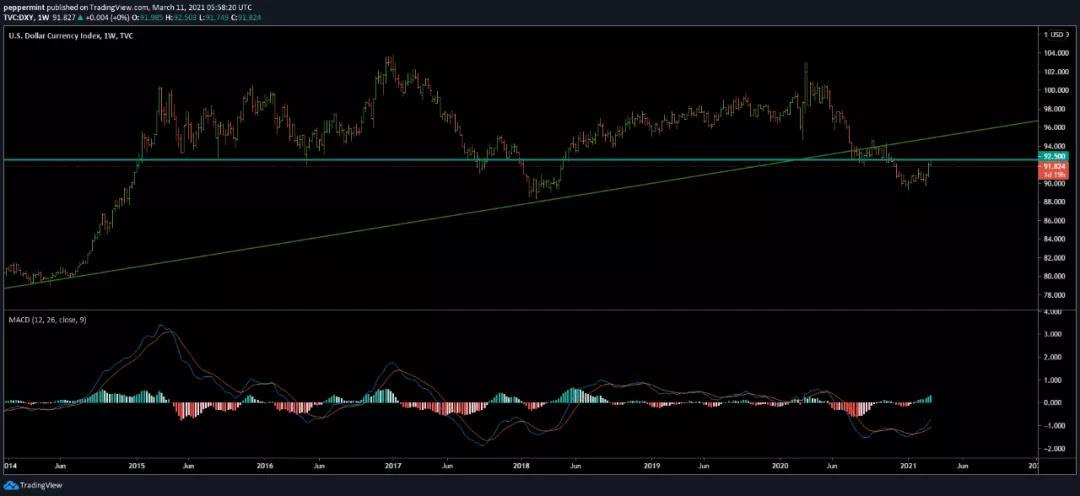 今天与大家分享的是美元指数DXY:从图形来看,美元指数目前是在关键价位,如果美元继续走强料将会对股市带来一定压力,尤其是港股与A股。美元存在中长期贬值刚需,但其短期走势需要关注92.5与90这两个关键价格。