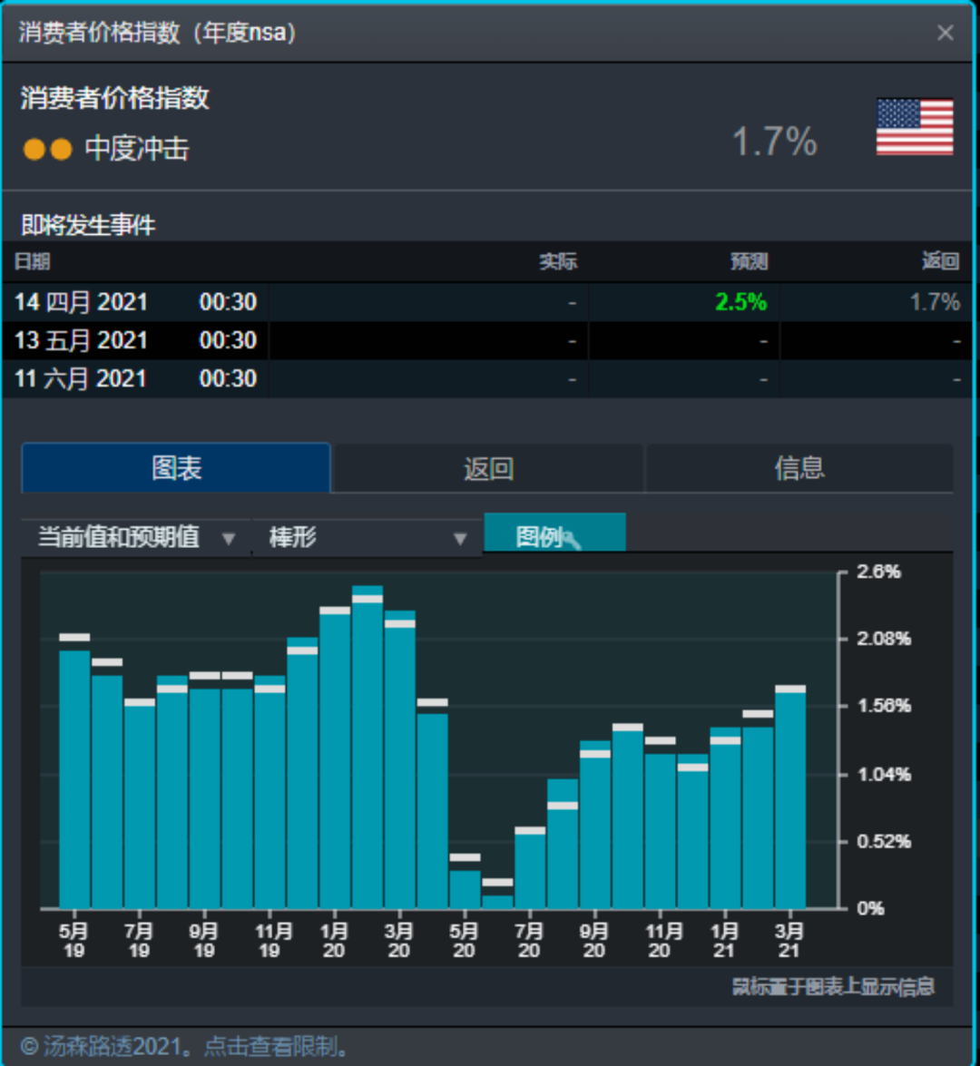 美国3月份消费者物价指数CPI将于本周三公布,预期路透社统计预估本次将较2月份增长0.5%,年度预估值将由之前的1.7%上升至2.5%,超过美联储出2%的通胀率目标。这个数据将潜在使得投资者对美联储提前收紧货币的预期增强,可能再次引发美国政府公债收益率走升,拉动美元上行。