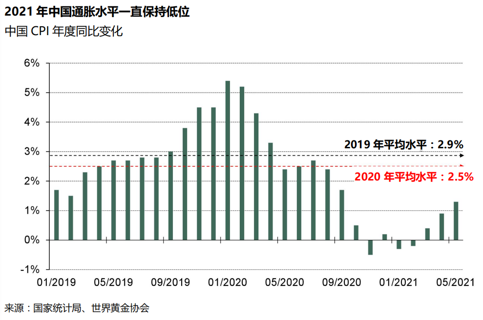 而2021年截至目前为止,中国投资者对于通胀的担忧也不及西方投资者。2021年随着商品价格的飙升,中国的生产者价格指数也迅速走高,但消费者价格指数则一直保持低位,主要源于食品价格的下跌以及今年截至目前经济需求相对平缓的复苏趋势,这也导致了国内投资者利用黄金对冲通胀需求的降低。