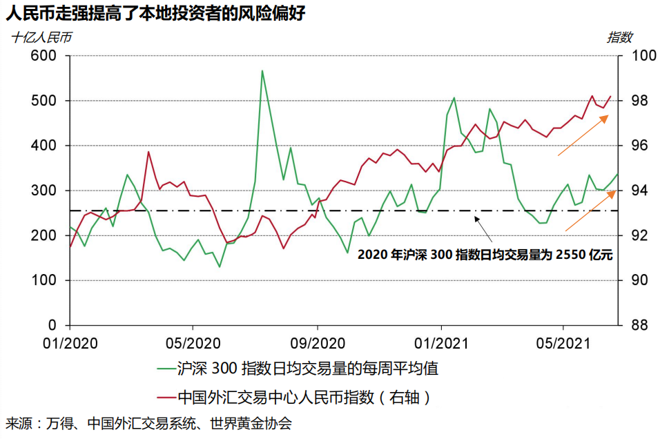 近期这样的差异主要是由于中国投资者的风险偏好高于西方投资者。随着最近CFETS人民币指数(由中国外汇交易中心开发,反映人民币对一篮子货币的稳定性)迅速攀升,强势的本地货币通常会提高本地投资者的风险承受能力,因为这一般意味着本地经济的走强。而更高的风险偏好又推动了国内投资者对于风险资产例如股票等的热情,从而降低了国内投资者们对黄金等避险资产的兴趣。