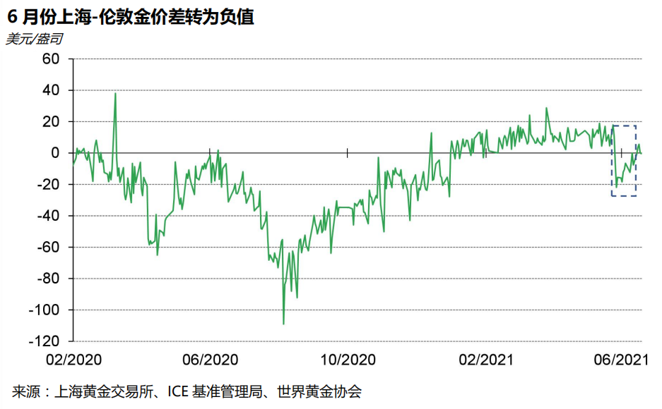 国内外黄金价差(上海-伦敦金价差)自2021年初以来一直为正值,但6月2日,上海-伦敦金价差跌至-6.7美元/盎司,且在该月内大多数时间均处于负值区间。虽然目前已逐步转正,但我们认为分析其大幅变动背后的驱动因素有助于市场更好地读懂当前中国黄金市场的供需变化,且对理解境内外黄金价差的变动有益。