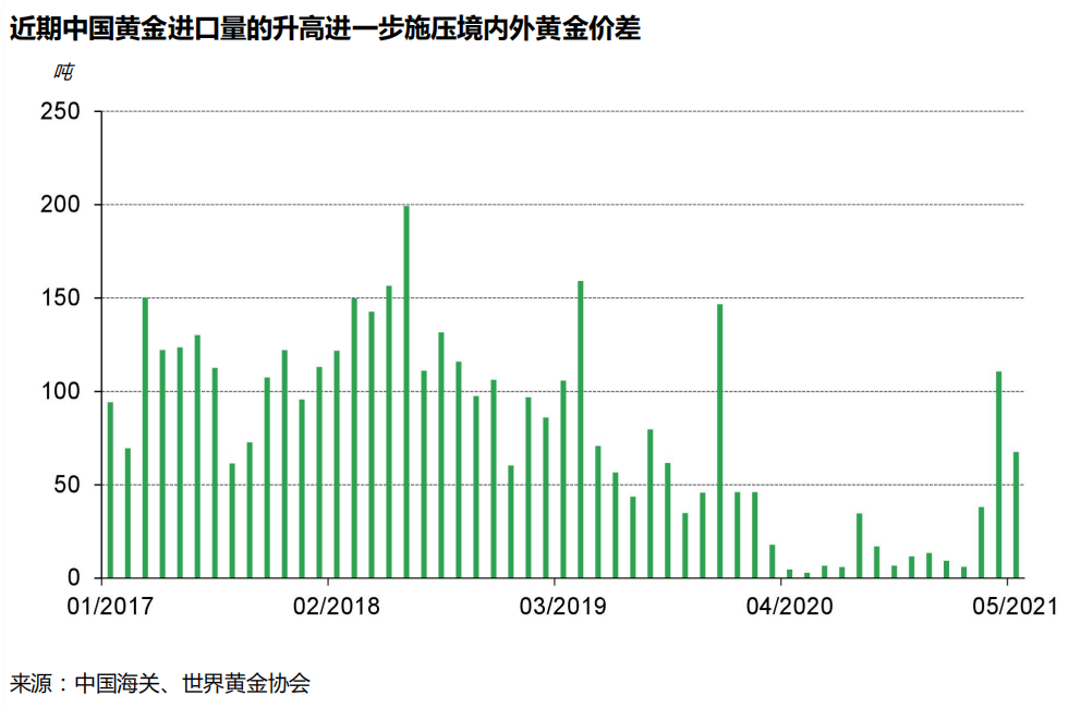 国内的黄金进口机制令国内金价多数时候相对海外保持溢价状态(2020年本地黄金需求严重受阻的情况除外)。中国黄金进口量在2020年及2021年初疫情期间保持低迷,但此后便迅速上升:2021年第一季度黄金进口量为54吨,4月和5月进口总量便快速跃升至178吨。