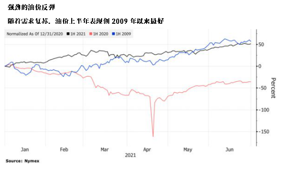 上半年油市完美收官,WTI原油期货2021年上半年收涨51.66%,创2009年以来最大半年涨幅;布伦特原油期货收涨45.11%,在过去一年中布油上涨超80%,目前接近2018年10月以来的最高水平。