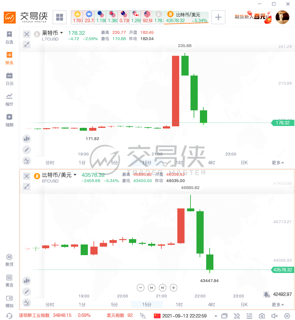 莱特币暴涨30%后直线跳水,比特币跟跌。