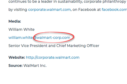 社交媒体上的许多人开始对沃尔玛这一声明的合法性提出了质疑。有网友发现,最大的奇怪信号是,在此前的推文中邮箱地址有误,如图显示,虽然William White确实是沃尔玛的首席市场官,但他的电子邮件地址链接的网站不是沃尔玛的。