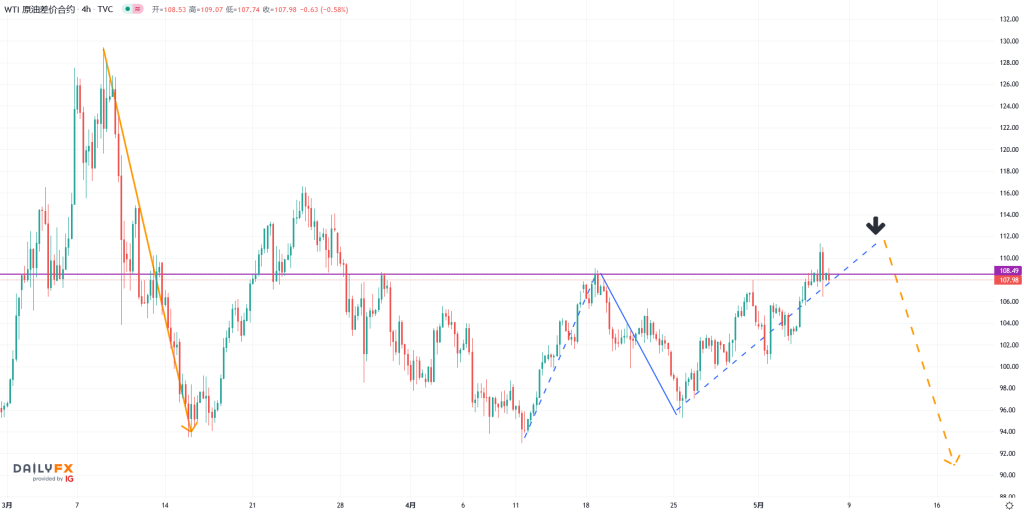 WTI原油周四(5月5日)盘中一度大涨3.5%至日内高位111.34美元,但其后辗转回落至108.0美元附近整理。毫无疑问,WTI原油于108.0附近水平是后市的重点关注对象,该水平得失料将对油价后市走势构成重要影响。