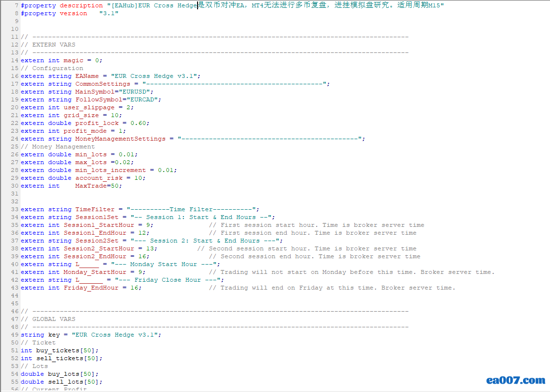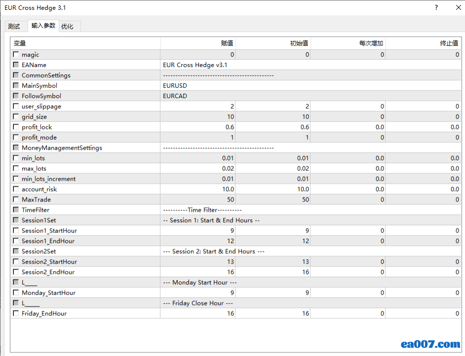 EUR Cross Hedge EA的主货币对是EURUSD,其实很多对冲EA的主货币对都是EURUSD。选用EURUSD作为主货币,我猜测是因为,EURUSD交易量大,相对稳定的原因。相关货币对是EURCAD,换成其他品种应该也可以,大家可以尝试一下。
