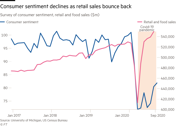 消费者支出是美国经济最强大的特征之一,推动了疫情中经济反弹。尽管如此,零售销售V型反转的同时密歇根大学消费者信心指数陷入数月低迷。
