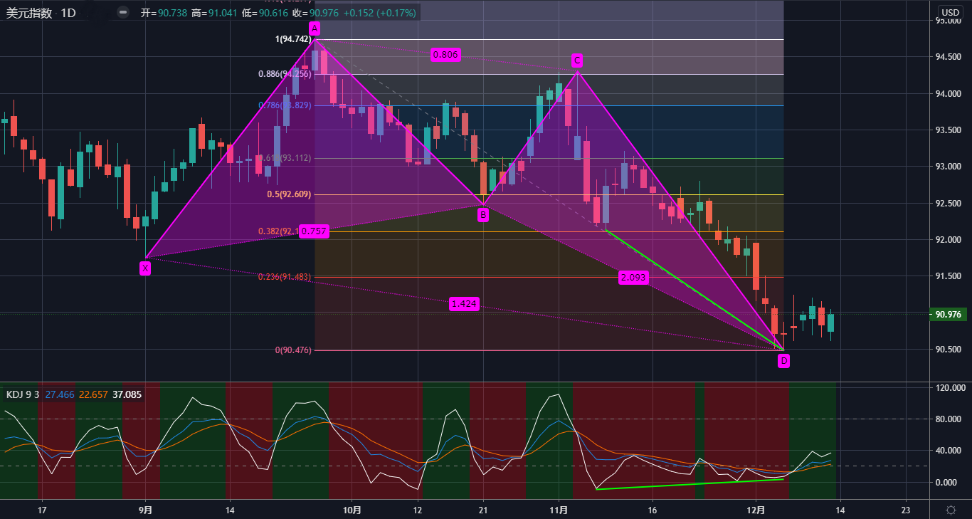 美元指数的日线图显示,9月1日,价格下探91.75(X点)后反弹至94.74(9月25日高点,B点),随后行情震荡走低,于12月4日最低触及90.48(D点),有望构成看涨蝴蝶模式: