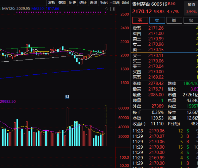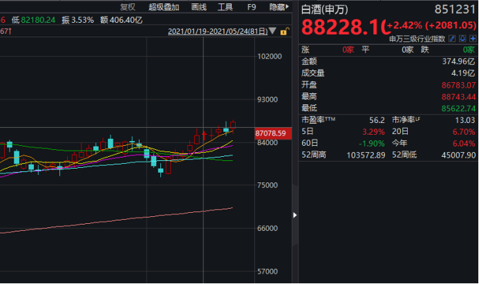 酿酒板块市值最高的贵州茅台也大幅上涨,盘中站上2200元大关,大涨6.21%。