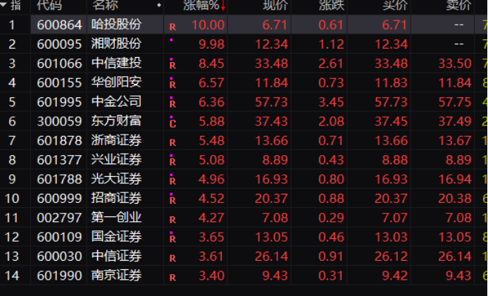 互联网券商龙头东方财富也大幅上涨,该股盘中涨幅超过6%,成交额突破90亿元。