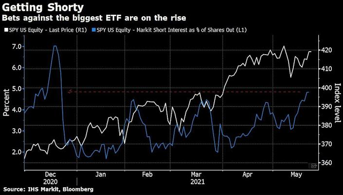 在美股震荡于历史高点附近之际,投资者正通过加码做空全球最大的交易所交易基金(ETF)来押注标普500指数即将回调。根据IHS Markit Ltd.的数据,规模达3570亿美元的SPDR S&P 500 ETF Trust的空头头寸已经跃升至今年以来的最高水平。