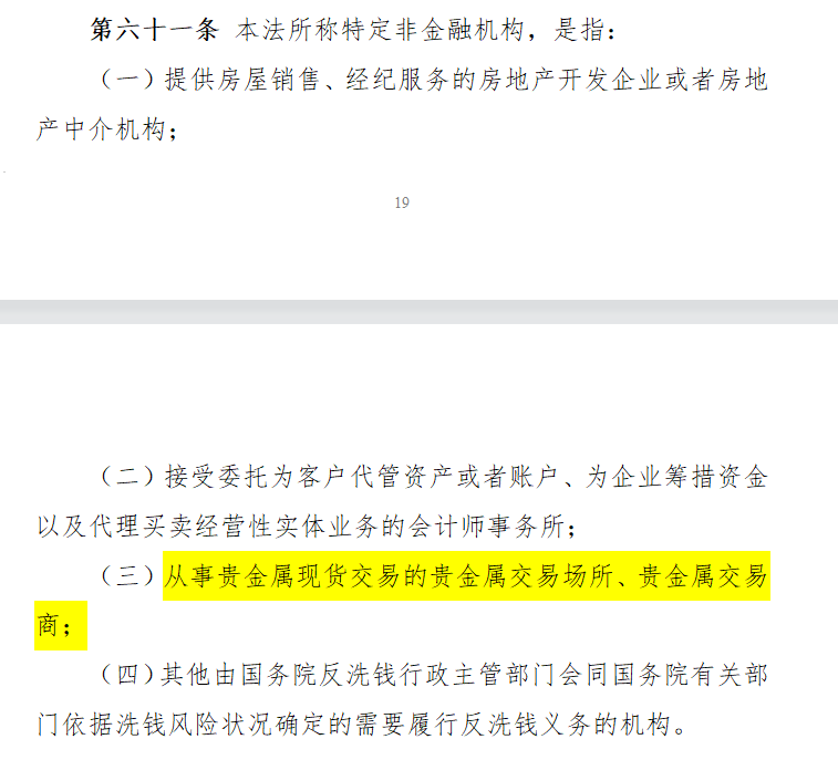 反洗钱法草案中给出了特定非金融机构的定义,其中包括:提供房屋销售、经纪服务的房地产开发企业或者房地产中介机构;从事贵金属现货交易的贵金属交易场所、贵金属交易商。征求意见的反馈截止时间为6月30日。