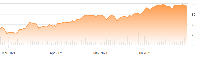 当前,房地产市场依然炙手可热,有迹象表明房地产市场中需求仍远高于目前的供应。iShares住宅和多部门房地产交易所交易基金最近图表也显示了这个房市火热的情况: