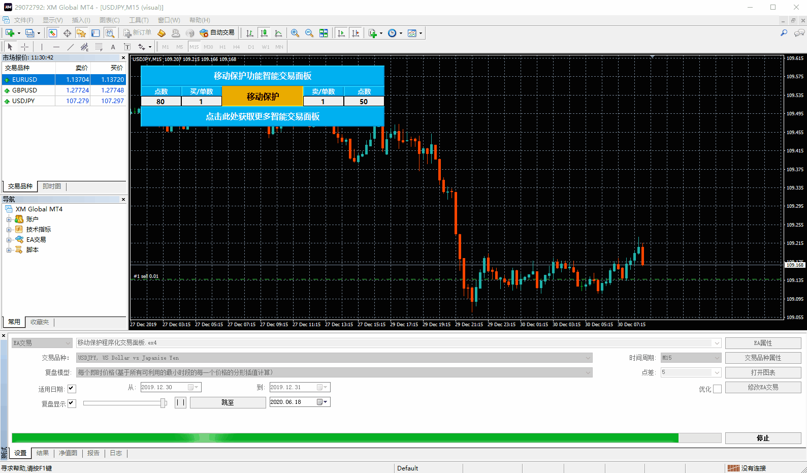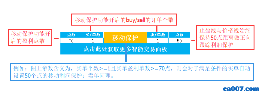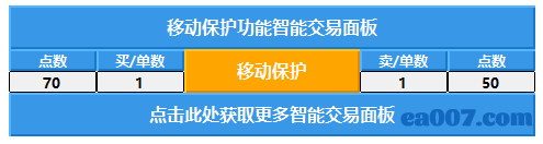 移动保护程序化交易面板,是一种对订单利润进行逐一移动跟踪保护的利润保护按钮化交易工具,灵活便捷,最大化的保护订单利润!它可以根据用户的需求灵活的调整利润保护点数,以及开启该项功能的持仓数。不止做到只要订单有利润,就不亏损离场,而且移动式最大化的保护每一张订单的利润。