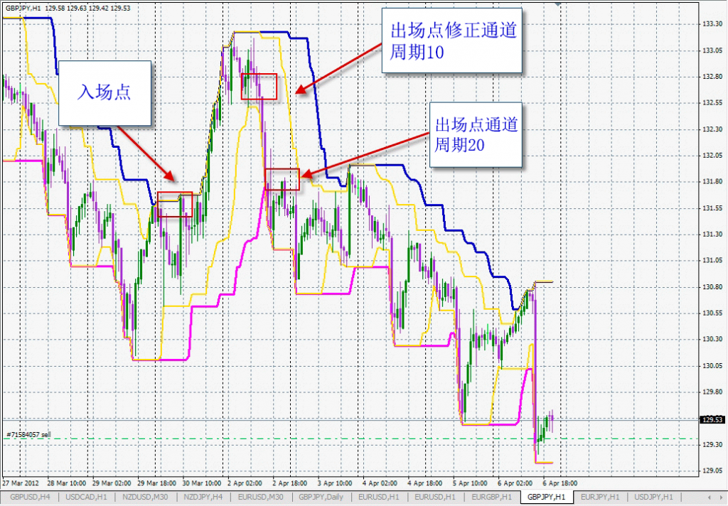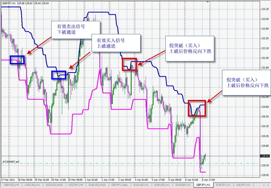当K线形成于唐氏通道下轨(红色)下方时,必须开仓做空并平仓所有多头头寸。